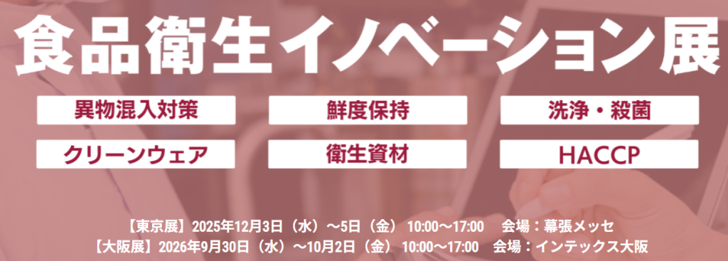 2025年12月3日(水)~5日(金)の3日間、幕張メッセ 10ホールにて開催される「食品衛生イノベーション展」に出展いたします。